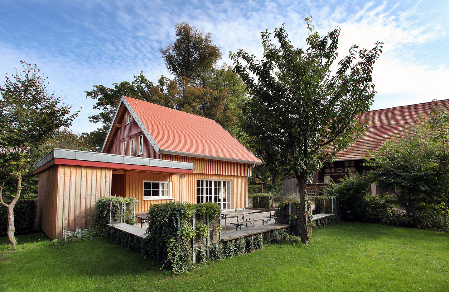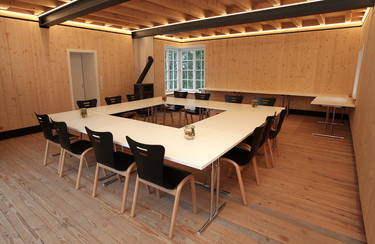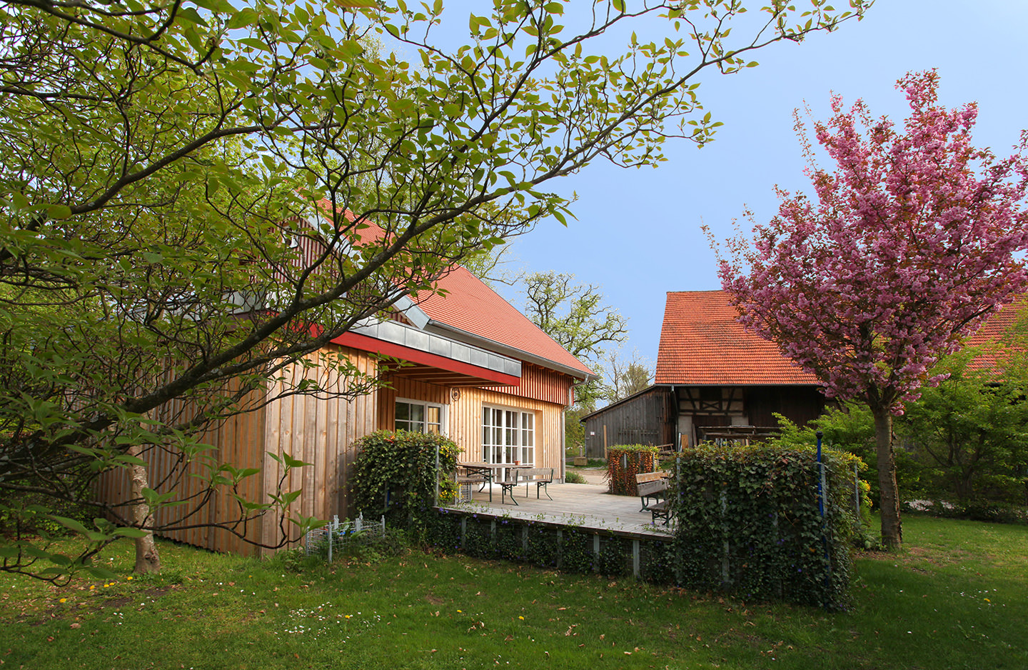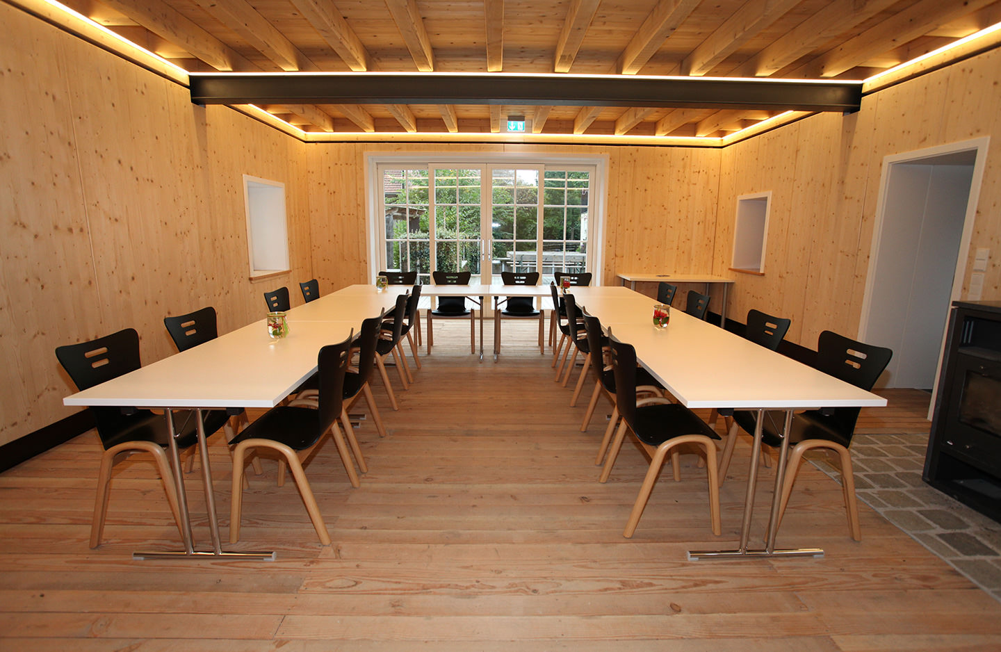 An adjacent building 'The Courtyard House' has a fully equipped communal kitchen with dishwasher, a spacious lounge with fireplace and a snug terrace, which can be additionally hired on request by our holiday guests. Here you can cook, eat, work, hold seminars/meetings, play, party and enjoy together.